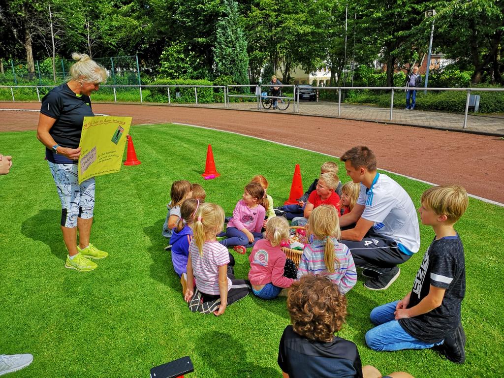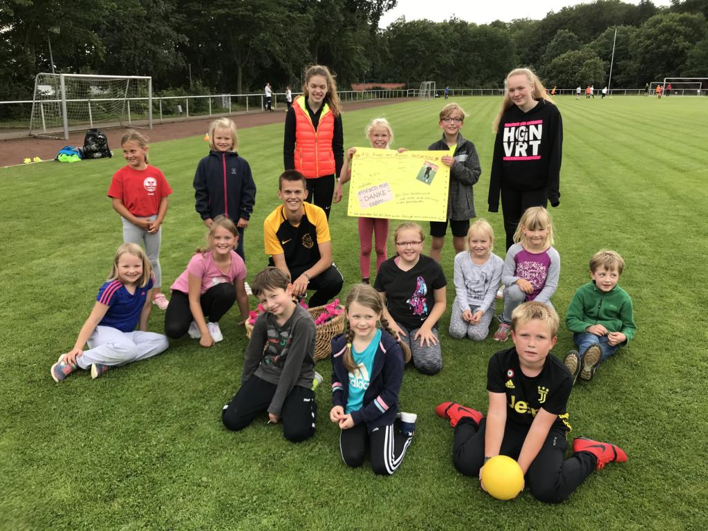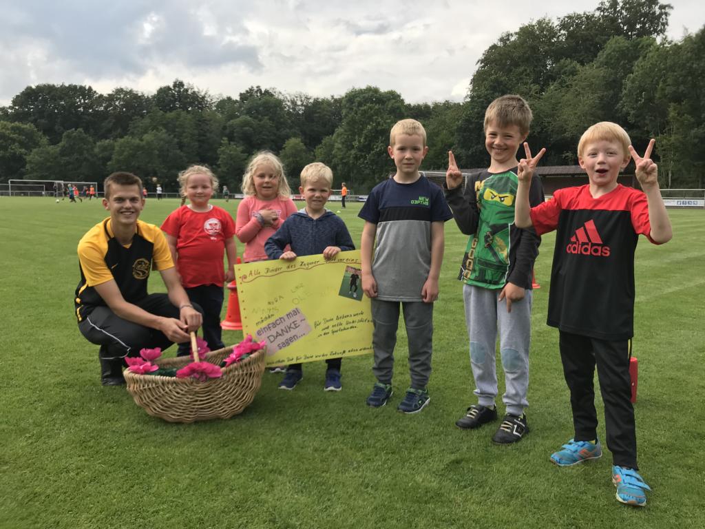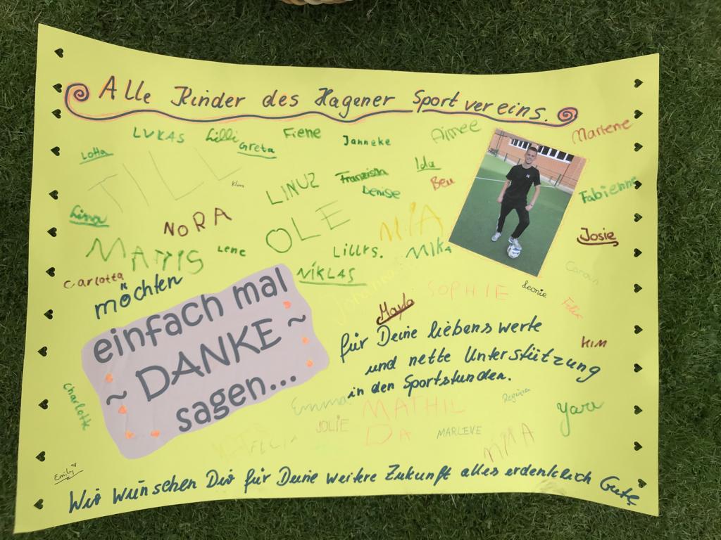 Fast ein Jahr ist es her, dass Christopher Gausmann im August 2019 sein Bundesfreiwilligendienst beim Hagener Sportverein begonnen hat und nun wurde er von den Kinderturngruppen mit einem herzlichen Dankeschön verabschiedet. Weil die Trainingsstunden wegen der Corona-Situation nach draußen verlegt wurden, fand die Verabschiedung auf dem Hagener Rasenplatz statt. Als Überraschung erhielt  er von jeder Kindersportgruppe einen Präsentkorb, gefüllt mit allerlei Dingen, wie selbstgemachte Marmelade, Gummibärchen, Schokolade, Plätzchen, Nudeln, eingelegte Gurken -  alles, was man so „zum Leben“ braucht.  Die Kinder hatten außerdem auch Bilder gemalt, Steine gefärbt und dazu noch Briefe zur Verabschiedung geschrieben. Ein großes Plakat mit Unterschriften der Kinder soll Christopher noch lange an diese schöne Zeit erinnern. Auch er bedankte sich für die tollen Stunden mit einer Süßigkeit für die Kids.