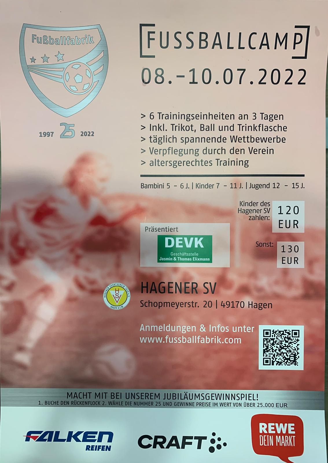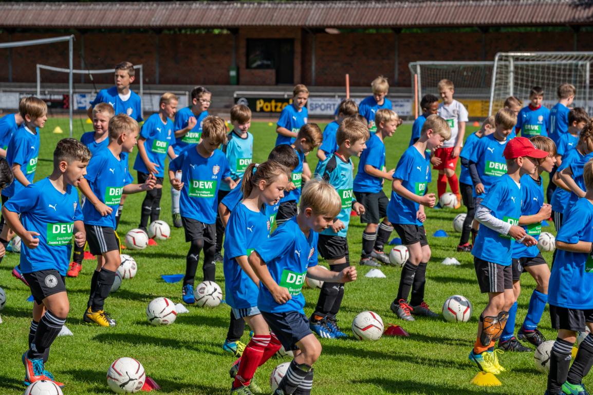 „Wir haben mit der Fußballfabrik einen zuverlässigen Partner, der in einem abwechslungsreichen Programm den teilnehmenden Kindern und Jugendlichen die Freude am Fußball und der Gemeinschaft nahebringt. „Wie sich alle hier gegenseitig anfeuern, aufmuntern und trösten, wenn mal was nicht geklappt hat, ist schon bemerkenswert. Wenn wir dann am Ende des Tages in die vielen fröhliche Gesichter blicken, dann ist das der Lohn für uns alle, die sich am Camp beteiligen“, so Fußballobmann Torben Plogmann. Damit verwies er auf die zahlreichen UnterstützerInnen, allen voran das DEVK Büro Elixmann, das sich als Hauptsponsor zeigte und am Abschlusstag mit Fotobox, Tattoo- oder Infostand für Abwechslung und Aufmerksamkeit sorgte. Neben der DEVK unterstützen weitere Sponsoren das Camp. So sorgte z.B. Stefan Brörmann für das Mittagessen am Samstag oder Mario Plogmann für die Versorgung mit Würstchen am Sonntag. „Allen Sponsoren gilt unser großes Dankeschön. Ohne die Verbindung dieser Sponsoren zum Verein und zur Jugendarbeit ist ein solches Camp nicht möglich. Danke auch dem Orga-Team vom Hagener SV, das sich um das gesamte drumherum gekümmert hat“, so Plogmann bei der Verabschiedung aller TeilnehmerInnen. Zum Abschluss des Camps gab es die begehrten Trophäen für verschiedene Wettbewerbe. Das DEVK Büro hatte zudem für alle Jungen und Mädchen einen Pokal gestiftet. Die zahlreich erschienenen Eltern und Freunden/Freundinnen verabschiedeten alle mit großem Applaus.