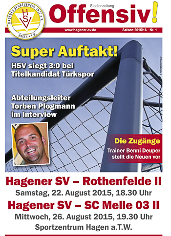 Mit einem 3:0-Sieg beim Aufstiegs-Aspiranten Türkspor Melle sind die 1.-Herren-Fußballer des HSV erfolgreich in die neue Kreisliga-Saison gestartet. Nun stehen in der Liga glech zwei Heimspiele in Folge auf dem Programm: Am Samstag, 22. 8., gastiert um 18.30 Uhr die Reserve vom SV Bad Rothenfelde am Hagener Jägerberg. Am Mittwoch, 26. 8., empfängt der HSV um 19.30 Uhr den SC Melle II. Pünktlich zu diesen Partien ist die erste Ausgabe der Stadionzeitung "Offensiv!" erschienen. Darin stellt Trainer Benni Deuper die Neuzugänge Kevin Jurasch, Mirko Messerschmidt und Lucas Draws vor. Außerdem gibt es u.a. ein Interview mit Fußballobmann Torben Plogmann und einen Spielbericht vom erfolgreichen Start der 2. Damen zu lesen.