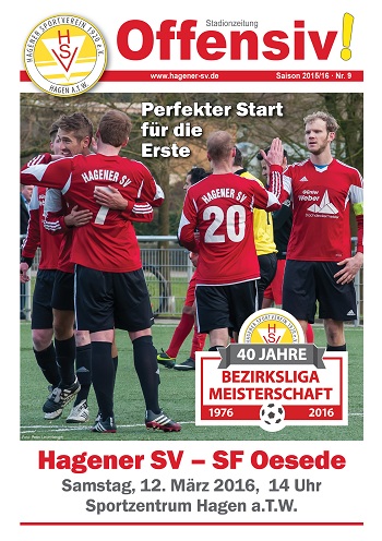 Vor 40 Jahren, in der Saison 1975/76, feierte die Fußballabteilung des Hagener SV mit dem Titelgewinn in der Bezirksliga einen ihrer größten Erfolge. Das "Offensiv!"-Heft startet zu diesem Jubiläum eine Serie mit historischen Zeitungsartikeln, die die sensationellen Leistungen der HSV-Meisterelf um die Wethkamp-Brüder, Friedel Frommeyer, Jöppi Rottman, Kapitän Bernhard Ehrenbrink, Wolfgang Mähne, Bruno Hellermann, Torwart Heinz Sander & Co. noch einmal aufleben lassen.