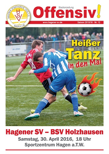 Nach zehn Siegen in Folge und dem 3:1-Erfolg bei Spitzenreiter Bad Laer gehen die 1.-Herren-Fußballer des HSV mit breiter Brust in das Derby gegen den BSV Holzhausen. Die Zuschauer dürfen sich auf einen „heißen Tanz in den Mai“ freuen, wenn der zweitplatzierte Hagener SV am Samstag, 30. 4., um 18 Uhr den Vierten empfängt. Beide Teams trennt in der Tabelle nur ein Punkt und nur der Derbysieger kann sich noch eine Minimalchance auf den Meistertitel ausrechnen. Zu diesem Spitzenspiel, zu dem rund 500 Zuschauer erwartet werden, ist eine neue Ausgabe der Stadionzeitung „Offensiv!“ erschienen, die hier bereits als PDF abrufbar ist.