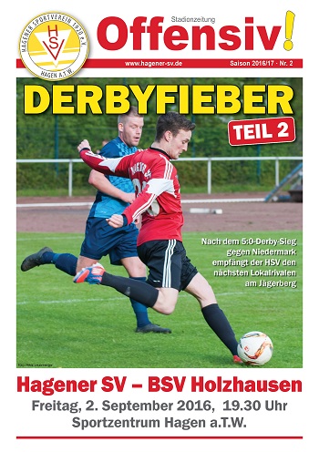 Nach dem 5:0-Derby-Sieg gegen Niedermark empfängt der HSV am Freitag den nächsten Lokalrivalen am Jägerberg. Um 19.30 Uhr wir das Spiel gegen den BSV Holzhausen angepfiffen, der mit zwei Siegen und einer Niederlage in die Saison gestartet ist. "Holzhausen gehört mit seinem außergewöhnlichen, guten Kader zu den Top-Favoriten auf die Meisterschaft. In der letzten Saison wurden leider beide Derbys verloren, weshalb wir uns vornehmen, die gute erste Halbzeit von Neuenkirchen möglichst auf die gesamten 90 Derby-Minuten zu transportieren, um Holzhausen zu bezwingen", schreibt Hagens Trainer Thomas Schilling in der aktuellen Stadionzeitung "Offensiv!", die über unten stehenden Link bereits als PDF erhältlich ist und in gedruckter Form am Freitag am Sportplatz ausliegen wird.