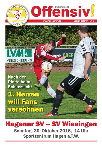 Nach der bitteren 1:2-Pleite beim Tabellenletzten FC Bissendorf möchte die 1. Herren am kommenden Sonntag, 30. Oktober, die Fans versöhnen. Dann gastiert um 14 Uhr das Team vom SV Wissingen am Hagener Jägerberg, gegen das der HSV in der dritten Runde des Kreispokals mit 5:4 gewinnen konnte. Zu dieser Partie ist eine neue Ausgabe der Stadionzeitung "Offensiv!" erschienen, die hier bereits als PDF abrufbar ist und ab Mittwoch u.a. bei Sporttreff Kortlücke und der Q1-Tankstelle in gedruckter Form ausliegen wird.