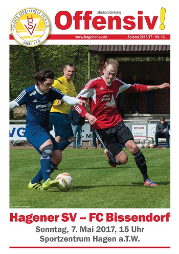 Die 1.-Herren-Fußballer des Hagener SV befinden sich auf der Zielgeraden der Kreisliga-Saison. Nach den letzten beiden Siegen gegen Schledehausen (3:1) und Hasbergen (6:1) möchte der HSV auch die restlichen vier Spiele erfolgreich bestreiten. Zum vorletzten Heimspiel empfängt die Mannschaft am Sonntag, 7. Mai, um 15 Uhr den Tabellenletzten FC Bissendorf, gegen den es noch etwas gut zu machen gibt. Im Hinspiel unterlag Hagen mit 1:2. Zu dieser Partie ist eine neue Ausgabe der Stadionzeitung „Offensiv!“ erschienen, die hier als PDF zum Download bereit steht.
