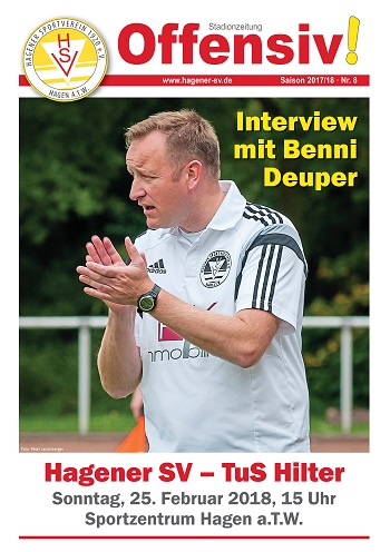 Nachdem am vergangenen Wochenende das Spiel beim SV Wissingen aufgrund widriger Platzverhältnisse abgesagt werden musste, soll am Sonntag um 15 Uhr endlich das erste Punktspiel für die 1.Herren-Fußballer des HSV im Jahr 2018 über die Bühne gehen. Dann ist der Tabellenzehnte TuS Hilter zu Gast am Hagener Jägerberg. Zu dieser Partie ist eine neue Ausgabe der Stadionzeitung „Offensiv!“ erschienen, die hier bereits als PDF zum Download zur Verfügung steht. Neben einem Interview mit Trainer Benni Deuper sowie einem Artikel über die Vorbereitung der Ersten gibt es Spielberichte von der 2. und 4. Herren. Außerdem nimmt Lisa Glasmeyer die Leser mit zum Fußballplatz des Jahrhunderts ...