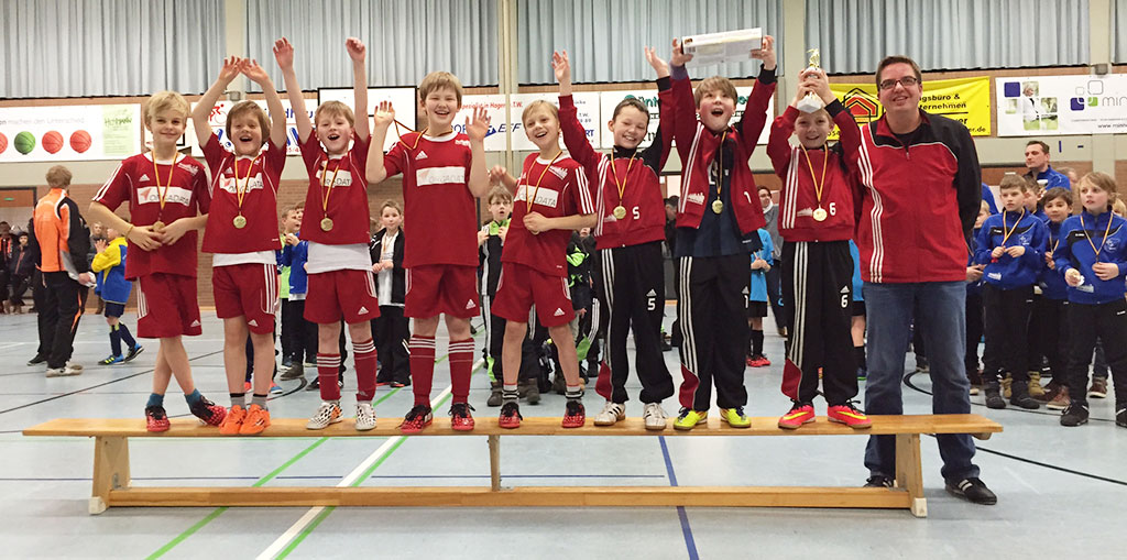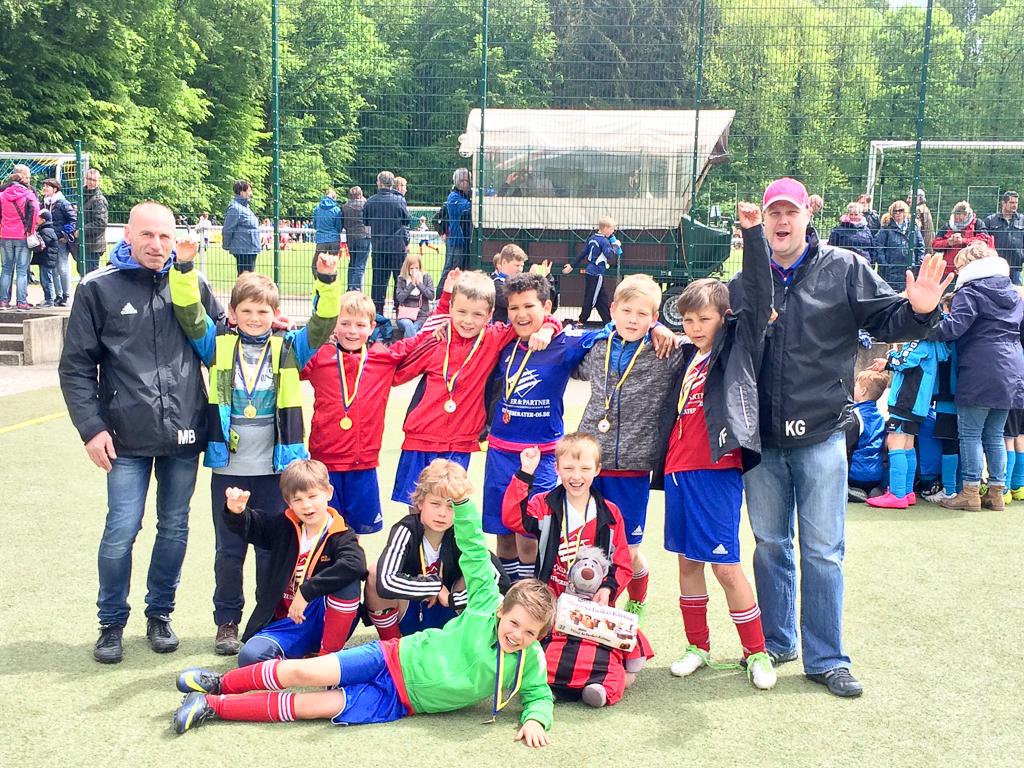 Leider reichte die phantastische Leistung von 6 Siegen und 2 Unentschieden bei nur einem Gegentor nicht zur Teilnahme am Endspiel. Im kleinen Finale konnten sich die Nachwuchsfußballer aber durch ein 1:0 gegen die Kicker von der Spvg. Gaste-Hasbergen den hochverdienten 3. Platz und damit einen tollen Pokal sichern.