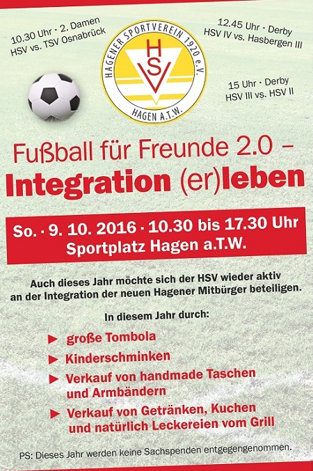 „Fußball für Freunde 2.0 - Integration (er)leben“ - unter diesem Motto lädt der Hagener SV am 9. Oktober 2016 auf den heimischen Sportplatz ein. Dort wird nicht nur fußballerisch einiges geboten - (10.30 Uhr: Hagener SV II. Damen vs. SG TSV Osnabrück/BW Schinkel 09, 12.45 Uhr: Hagener SV IV vs. Spvg. Gaste-Hasbergen III, 15.00 Uhr: Hagener SV II vs. Hagener SV III) - sondern es finden auch viele Aktivitäten rund um die Spielstätte statt. Neben Kaffee, Kuchen, Würstchen und diversen Kaltgetränken werden auch selbstgenähte Taschen und Armbänder verkauft. Letztgenanntes wurde im Vorfeld von den Organisatoren gemeinsam mit einigen der neuen Mitbürger aus Afghanistan und Syrien angefertigt. Wobei auch vor Ort die Möglichkeit bestehen wird, selber Armbänder zu basteln und/oder T-Shirts anzumalen. Außerdem wird es eine Tombola, Kinderschminken und eine Hüpfburg geben.