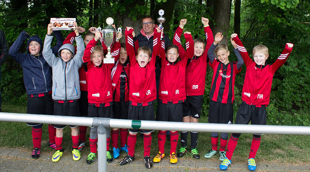 Strahlende Gesichter bei den E1-Kickern nach einem tollen Turnier in der Niedermark. Nach erfolgreichem Turniersieg feierte die Mannschaft ausgiebig beim obligatorischen Pokaltrinken.