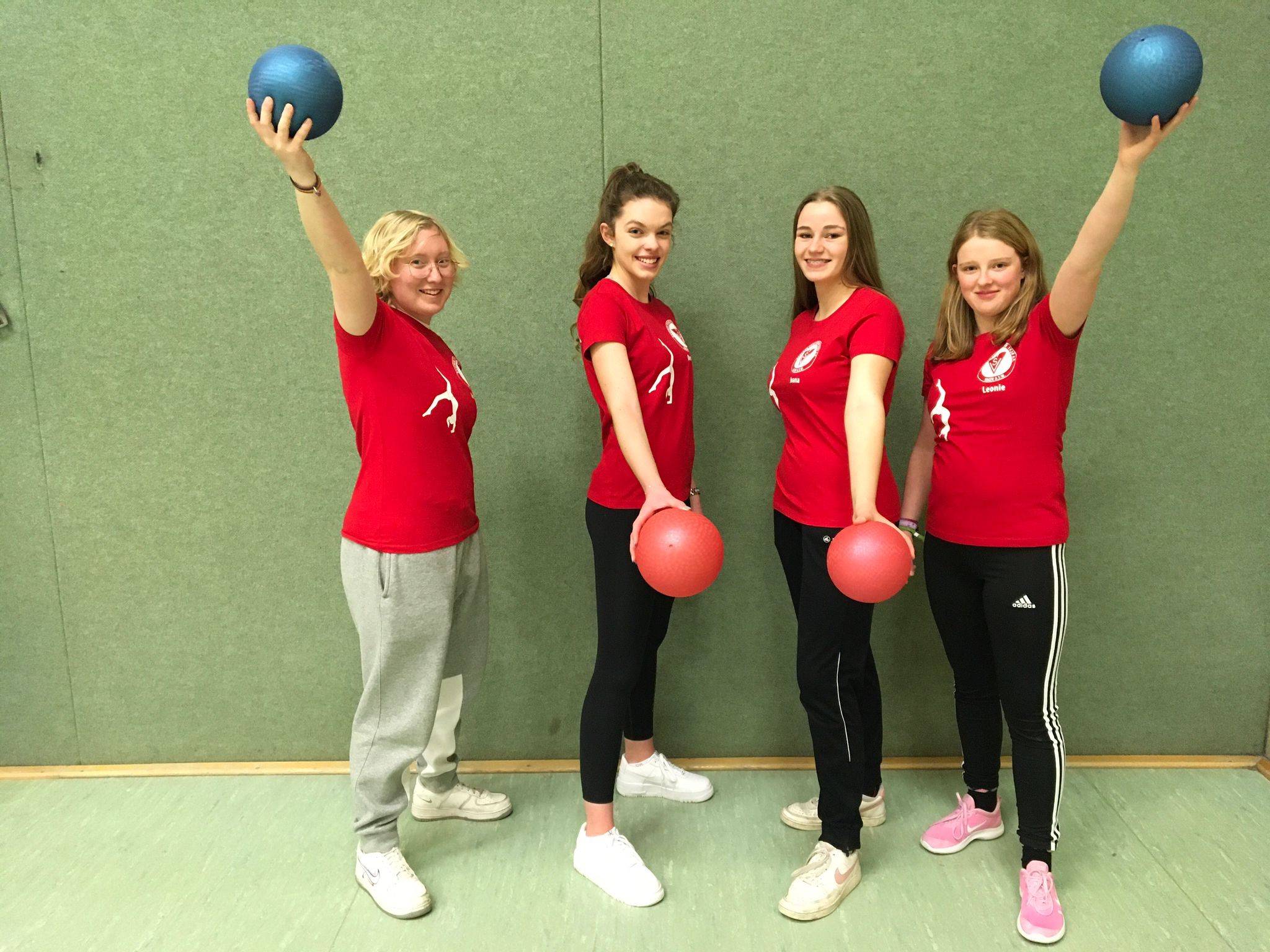 Die fünf frisch gebackenen Assistentinnen und Assistenten erhielten ihre T-Shirts ebenfalls. Maleen Butke, Lisa Kulgemeyer, Mayla Leimkühler, Moritz Winter und Paul Middelberg haben in den Herbstferien die Sportassistentenausbildung in Alfhausen erfolgreich abgeschlossen und unterstützen nun montags und dienstags die Kindergartengruppen. In toller Zusammenarbeit mit der FSJlerin Hanna und dem FSJler Bjarne helfen sie den Kindern beim Klettern, Rennen, Balancieren, Rutschen, Purzelbäume machen, Schleife zubinden und trösten bei kleinen Wehwechen.