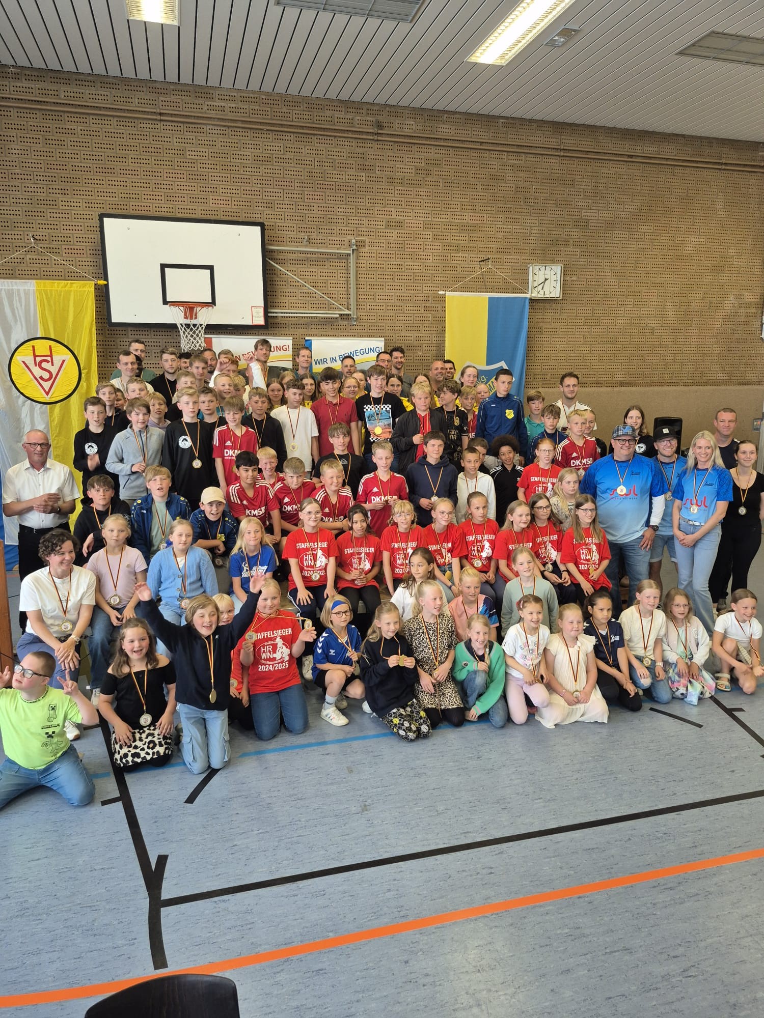 Am Freitag, 27.06.2025 hatte die Spvg. Niedermark als Ausrichter zusammen mit dem Hagener SV und der Gemeinde Hagen a.T.W. zur Ehrung der Meister*innen in die kleine Sporthalle geladen. Während stellvertretender Bürgermeister Michael Bensmann die Leistungen würdigte, führte Stefan Schönebeck durch das Programm. Insgesamt acht Mannschaften haben diese Saison erfolgreich beendet. Das waren im einzelnen die männliche D2 Fußball als Meister der 2. Kreisklasse, die weibliche F Jugend Handball als Meisterinnen der Regionsoberliga, die weibliche E Jugend Handball als Meisterinnen der Regionsliga, die männliche E 2 Fußball als Staffelsieger 1. Kreisklasse C, die U 15 Mädchen Fußball als Staffelsiegerinnen 1. Kreisklasse Staffel B, die U 12 Jungen Basketball als Meister der Regionsliga OS, die 1. Herren Basketball als Meister der Oberliga Niedersachsen und Aufsteiger in die 2. Regionsliga Nord und die Ü 35 Herren Basketball als Niedersachsenmeister.