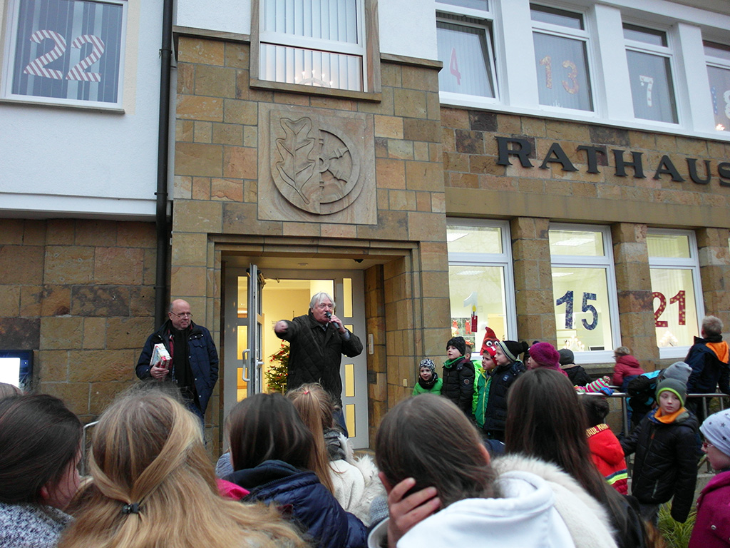 Erstmalig findet in diesem Jahr der Hagener Adventskalender in den 24. Fenstern des Rathauses statt. Den Auftakt machte gestern der Hagener Sportverein. Zahlreiche Kinder waren dem Aufruf gefolgt, an der Verlosung teilzunehmen. Aber auch für das leibliche Wohl war in der HSV-Nussknackerbude mit Kinderpunsch und Glühwein für 1 Euro gesorgt. Um die Spannung nicht direkt vorweg zu nehmen, trug HSV-Ehrenmitglied Manfred Böhnstedt zunächst zur Einstimmung ein Weihnachtsgedicht vor.